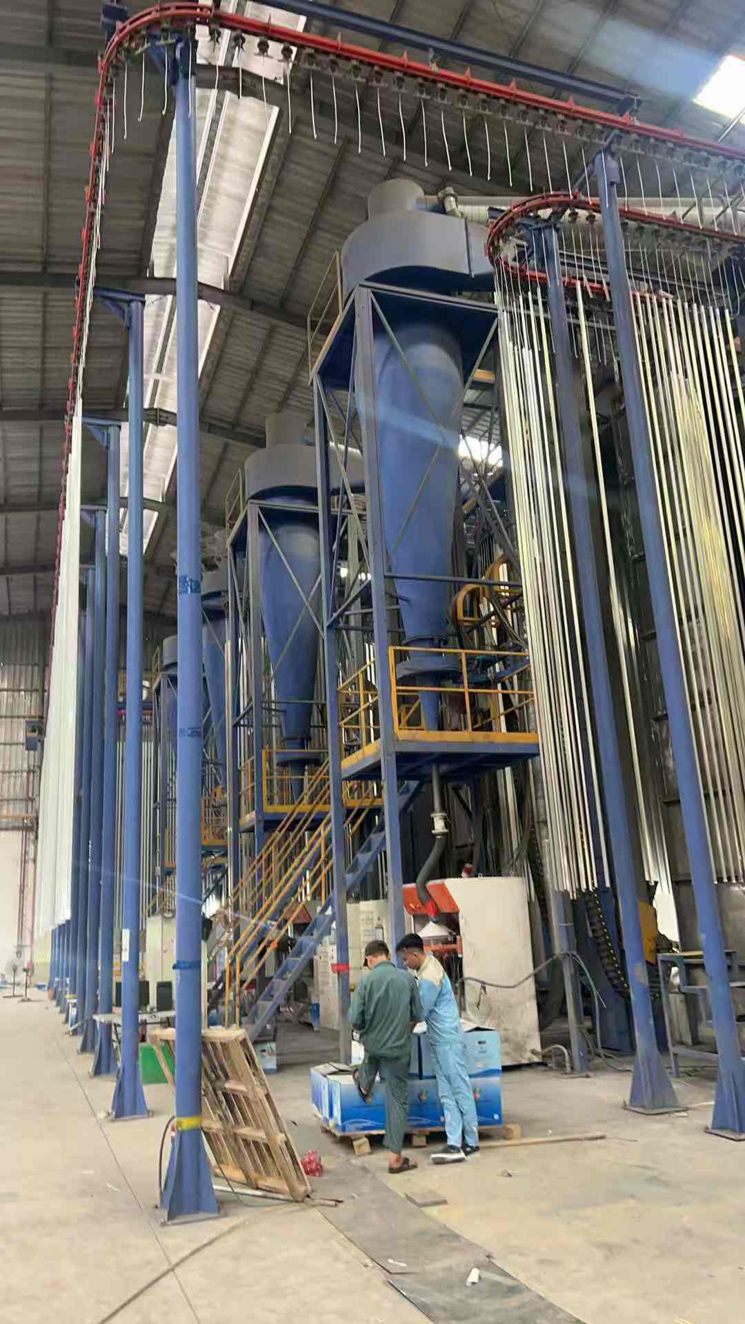 Composant principal:Système de convoyeur suspendu pour revêtement en poudre, système de chargement et de déchargement, prétraitement, four de séchage, chambre de revêtement en poudre et système de recyclage, four de cuisson, système de contrôle électrique, pistolets de revêtement en poudre, centre d'alimentation en poudre, compresseur d'air, système de machine à eau DI, etc.
